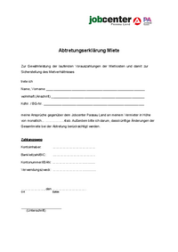 PDF herunterladen | 168 KBDas Geld für die Unterkunft und die Heizkosten wird in der Regel auf Ihr Konto überwiesen. Die im Mietvertrag festgelegten Beträge sind dann selbständig an den Vermieter und ggf. weitere Vertragspartner (z.B. Gasversorger) zu überweisen. Das Jobcenter kann die Kosten aber auch direkt an den Vermieter zahlen. Hierfür wird die folgende Abtretungserklärung benötigt.