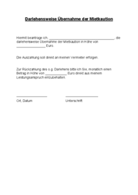 PDF herunterladen | 333 KBUnter bestimmten Voraussetzungen kann das Jobcenter ein Darlehen für die Mietkaution gewähren. Die Zuständigkeit liegt beim Jobcenter Ihres (neuen) Wohnortes. Es besteht jedoch kein grundsätzlicher Anspruch darauf. Erklären Sie bitte schriftlich, für welchen Betrag die darlehensweise Übernahme der Mietkaution erfolgen soll. Des Weiteren ist Ihr Einverständnis für eine direkte Auszahlung an den Vermieter (monatliche Tilgung in Höhe von 5 Prozent der Regelleistung) erforderlich.