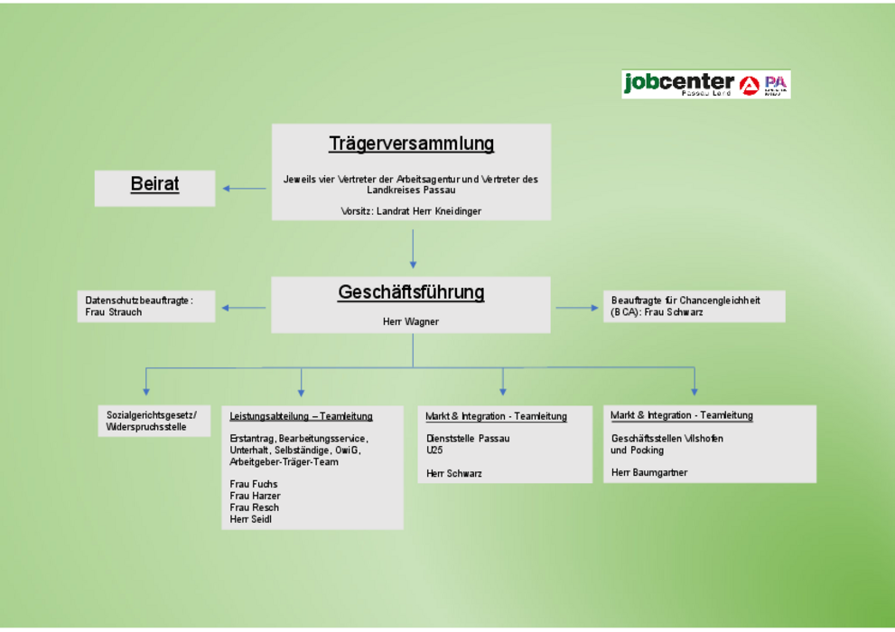 Das Jobcenter Passau Land wird durch die Trägerversammlung gesteuert (§ 44 c SGB II). Die Trägerversammlung entscheidet über organisatorische, personalwirtschaftliche, personalrechtliche und personalvertretungsrechtliche Angelegenheiten des Jobcenters.